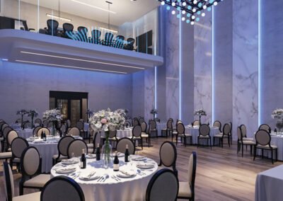 This massive space features two areas. The main ballroom area boasts tall windows from virtually floor to ceiling. Once you hit that ceiling, your eyes are fixated on a stunning lighted and moving art piece. Undulating like an ocean, these globes wave up and down with the option of changing through a rainbow of colors or dozens of vibrant two-tone glows.